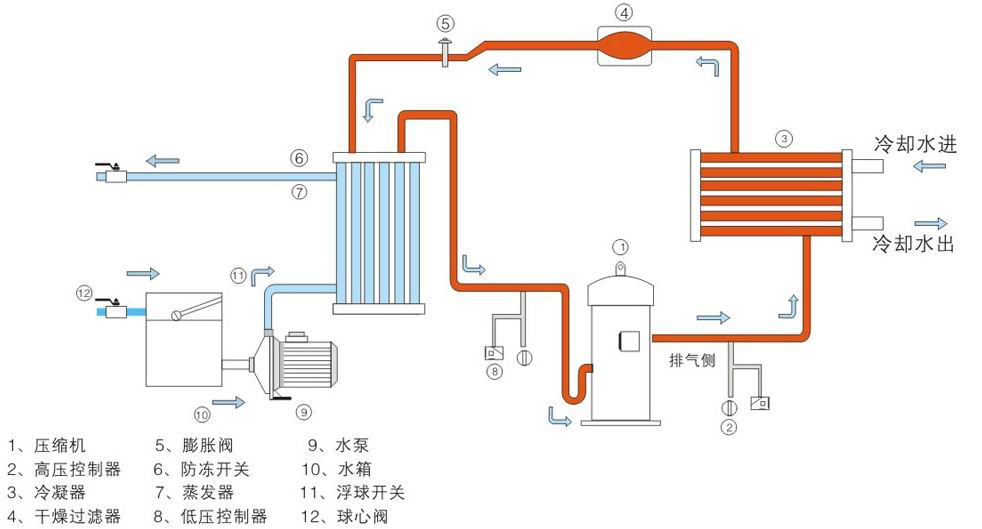 水冷式工業冷凍機組技術資料之工作原理圖如下